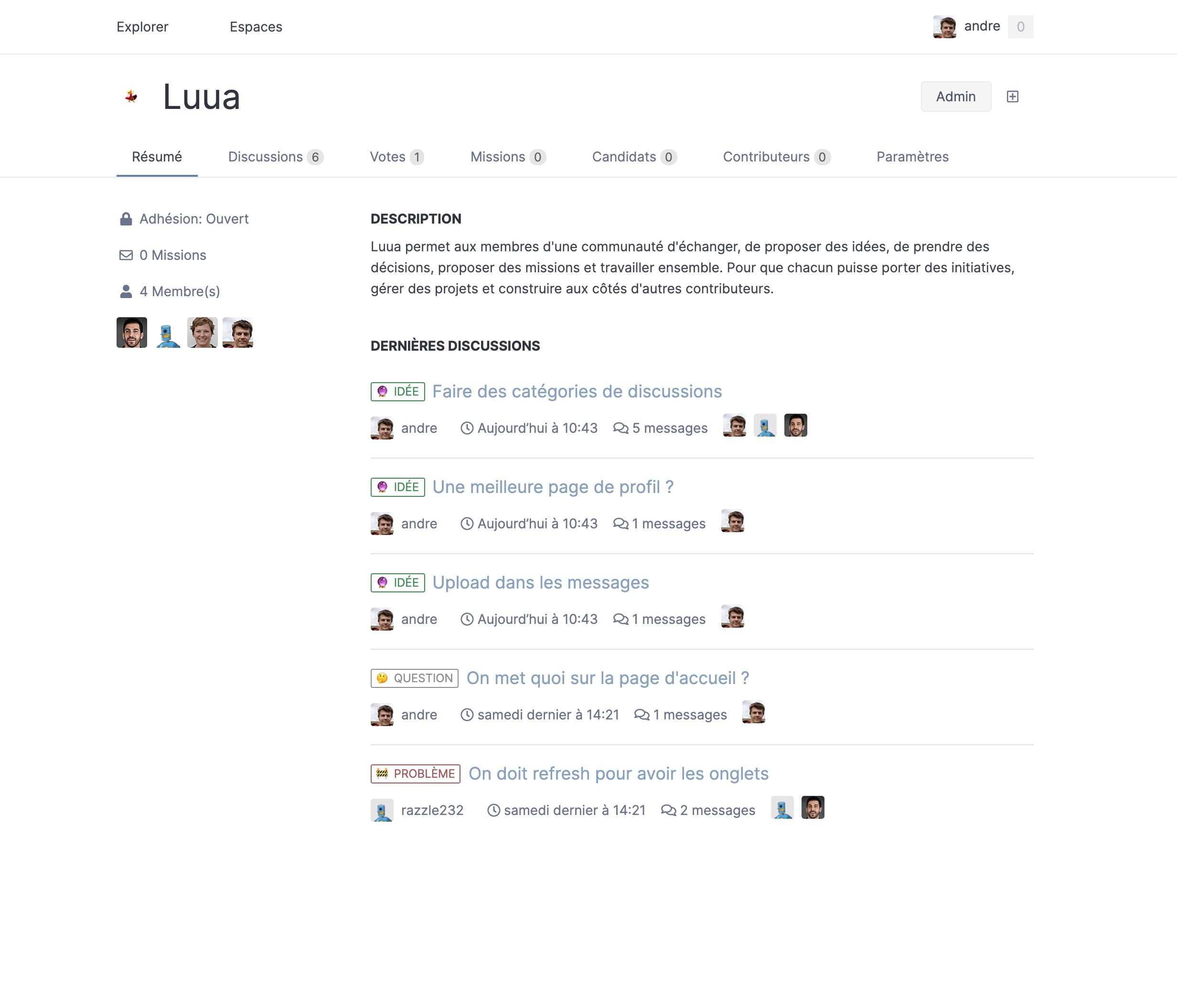 Luua permet aux membres d'une communauté d'échanger, de proposer des idées, de prendre des décisions, proposer des missions et travailler ensemble.